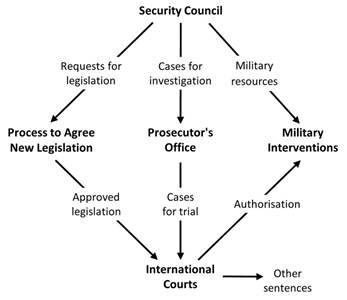 There is a need for more predefined law and less dependence on politicians making decisions on the basis of short-term national interests (6.6.4.2). The dynamic decision-making of the UN – where the Security Council acts as legislature, judge and enforcer – is unsound from a legal perspective (5.3.6.1). It would be better to have a clear separation of powers (5.2.8), which might look like the concept which is illustrated here: